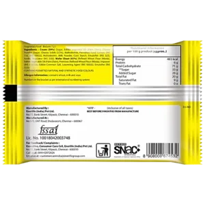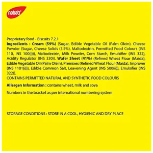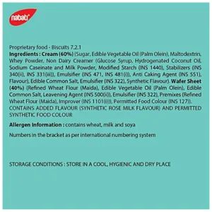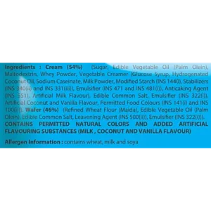 Cream (54%) (Sugar, Edible vegetable oil (Palm Olein), Maltodextrin, Whey powder, Non-Dairy Creamer (Glucose syrup, Hydrogenated Coconut oil, Sodium Caseinate and Milk powder, Modified starch(INS 1440), Stabilizer(INS 340(ii), INS 331(iii)), Emulsifier (INS 471, INS 481(i)), Anti-caking Agent(INS 551), Flavour), Edible Common salt, Emulsifier (INS 322), Synthetic flavour ).Wafer Sheet (46%) (Refined wheat flour (Maida), Edible Vegetable Oil(Palm olein), Edible Common salt, Leavening Agent(INS 500(ii)), Emulsifier (INS 322), Premixes(Refined Wheat Flour (Maida), Improver (INS 1101(i))), Permitted Food colour (INS 127)). CONTAINS ADDED FLAVOUR AND PERMITTED SYNTHETIC FOOD COLOUR.